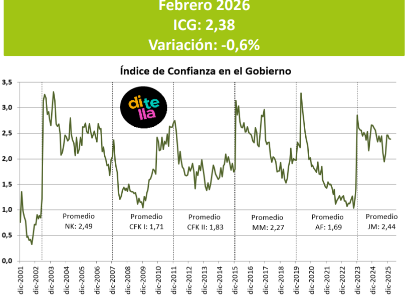 El Índice de Confianza en el Gobierno (ICG) que elabora la Universidad Torcuato Di Tella en febrero arrojó un valor de 2,38 puntos, lo que representa una caída de 0,6% respecto a enero y una baja de 6,8% respecto de febrero del año pasado (comparación interanual).