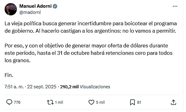 De todos modos, el Gobierno avanzó este lunes bien temprano, antes de la apertura de los mercados, con el anuncio de retenciones cero para todos los granos hasta el 31 de octubre. ¿Eso habla de que el Tesoro está próximo a prestarle dinero al Gobierno o todo lo contrario? Fue la primera pregunta que surgió una vez que el vocero Manuel Adorni lanzara en X el anticipo de alivio al campo.
