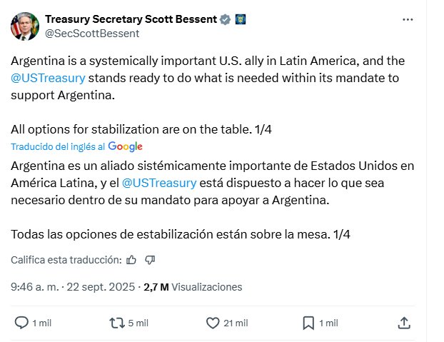 Mientras los rumores de un préstamo del Tesoro norteamericano -una medida muy poco usual- siguen corriendo, el Presidente decidió postergar por un día el viaje a Nueva York a la cumbre de la ONU en el marco de la cual iba a encontrarse con Kristalina Georgieva, titular del FMI, y Donald Trump, presidente de los Estados Unidos. Esa segunda reunión iba a ser clave para destrabar el préstamo, del que todavía no se conocen las condiciones, pero que sumaría para despejar las dudas del pago de compromisos más urgentes. En definitiva, se pagaría una deuda con otra. Resta conocer, si es que hay luz verde del Tesoro norteamericano, de cuánto dinero será. Eso, naturalmente dará la dimensión del impacto en los mercados.